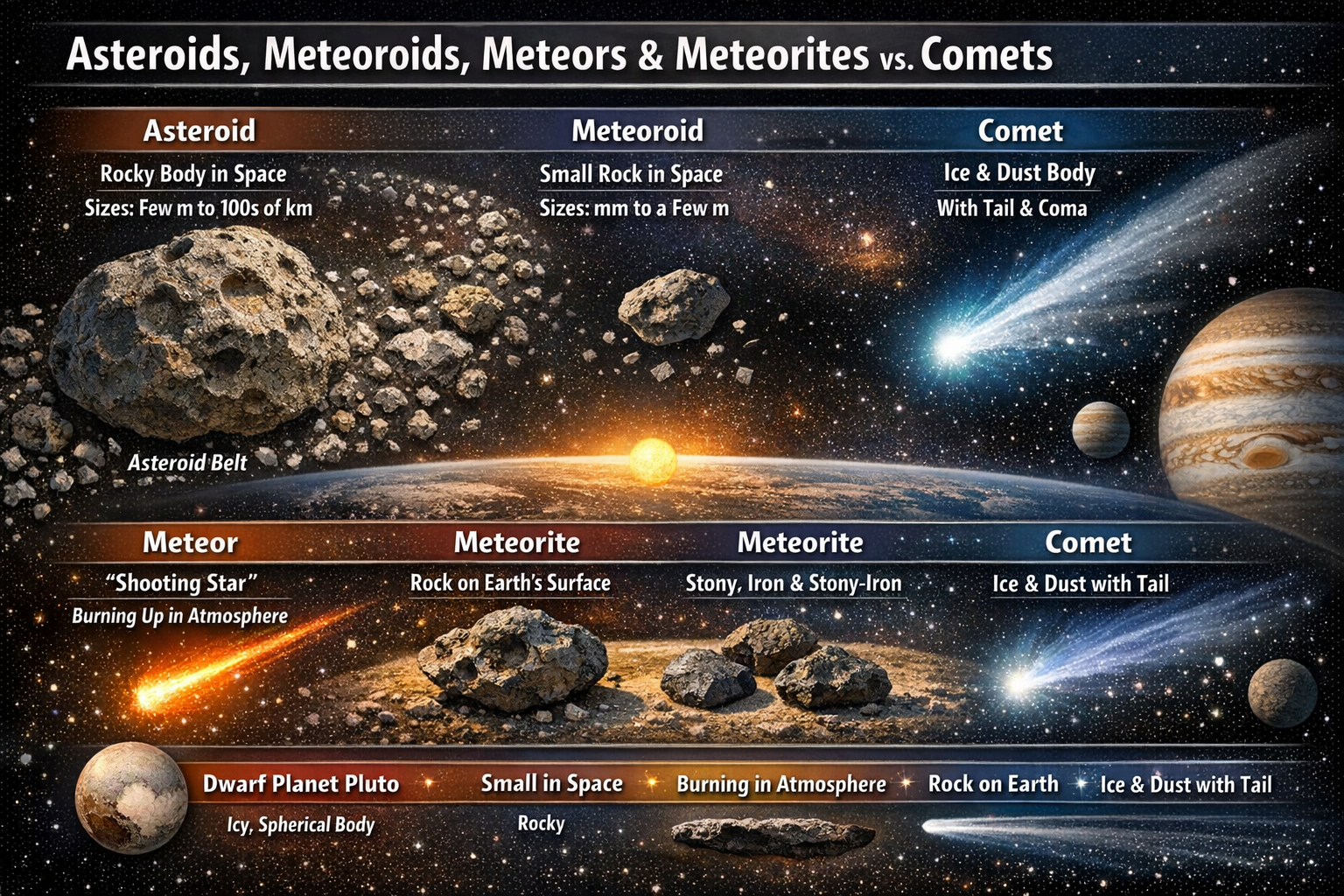 | Meteoroid | Space (small chunks) | Millimeters – Meters | Rock/Metal | Becomes a meteor in atmosphere |