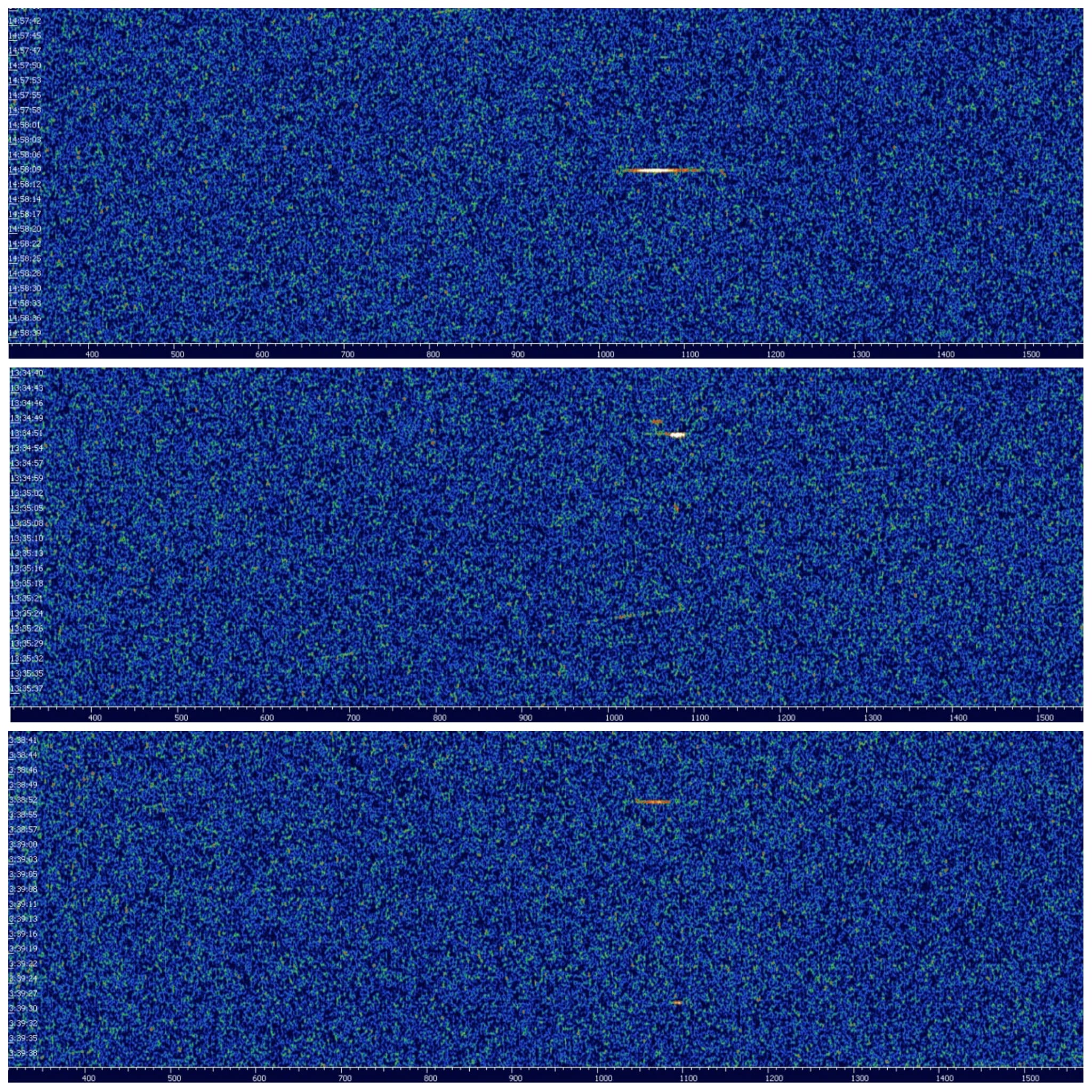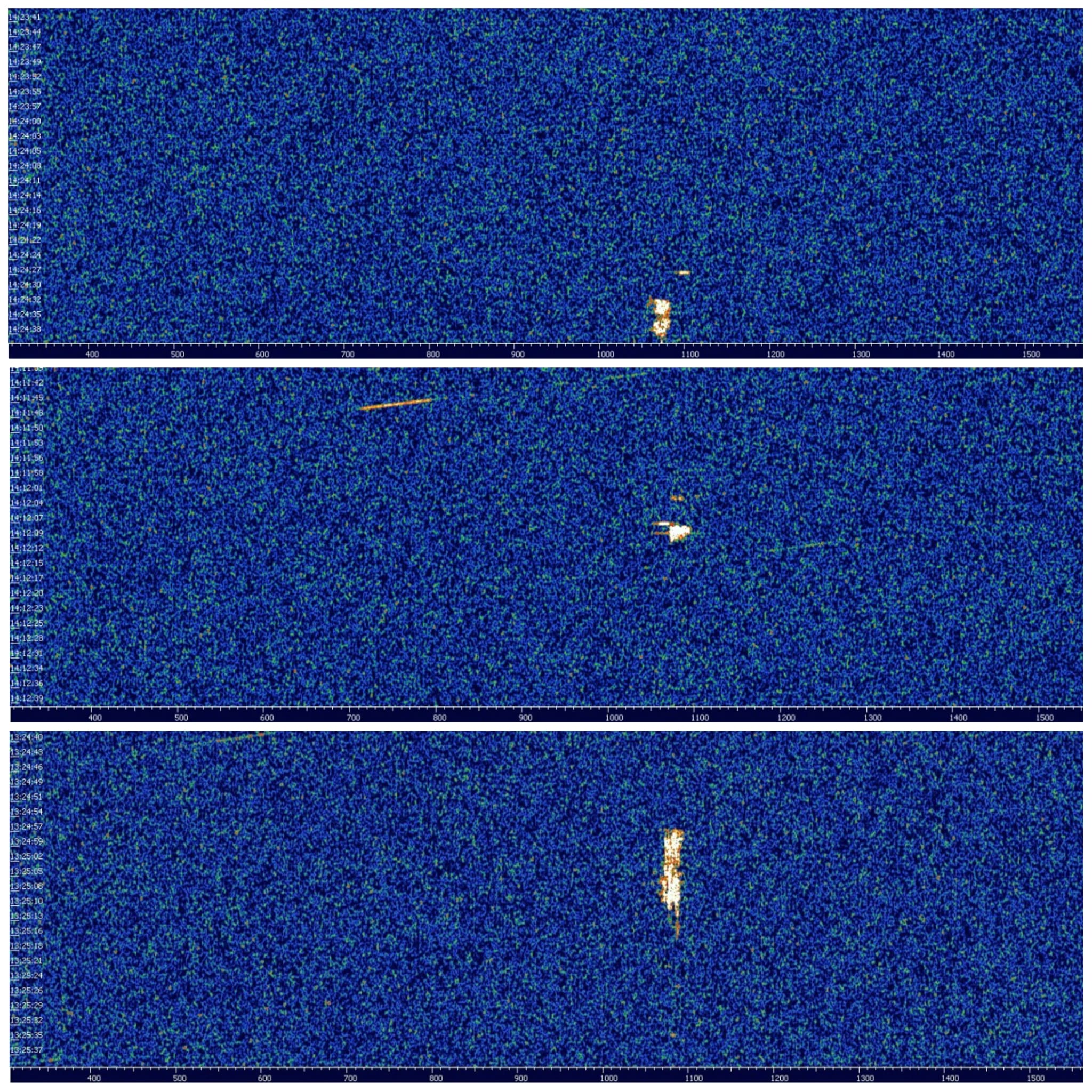 Airplanes: These, by contrast, move relatively slowly. Their relative speed changes very little, resulting in vertical lines. However, when observing the GRAVES transmitter from Berlin, airplane signatures are rarely or never seen because the transmitter is too far away and the planes fly too low.