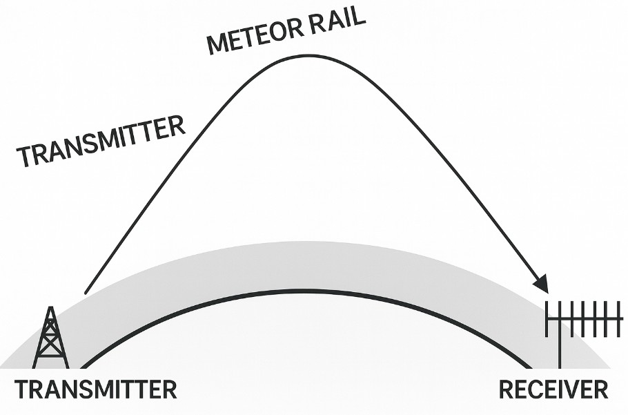 Unlike shortwave and mediumwave ranges, radio waves in the VHF (UKW) range are not reflected by the ionosphere. Therefore, only transmitters located within the line of sight of the horizon, or just behind it, can be received. If a transmitter is located far behind the horizon, its signals cannot be received directly by us. However, if its radio waves hit a meteor trail in the sky, they are briefly reflected and registered as a clear signal at the receiver, even hundreds of kilometers away.