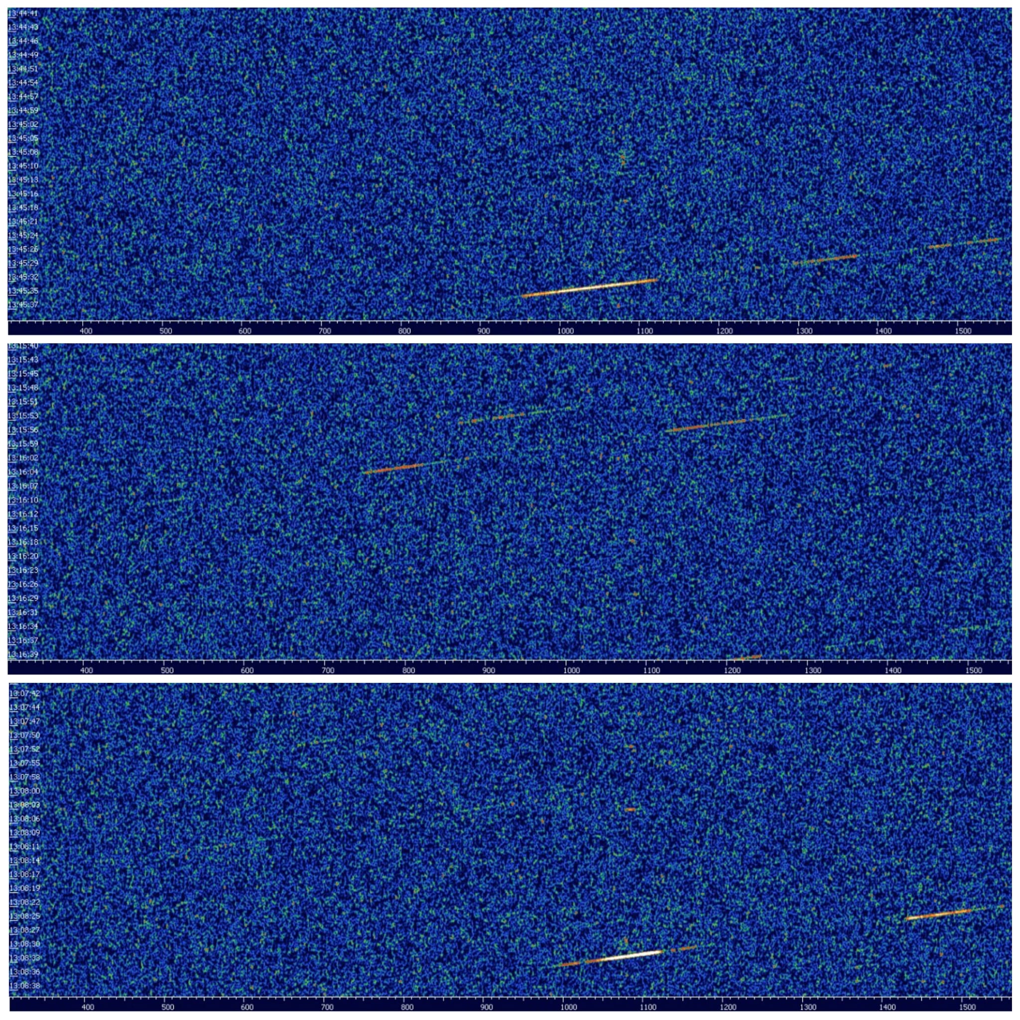 Satellites: In terms of velocity change, satellites lie between meteors and airplanes. Their flight altitude is much higher, which is why they can be seen from Berlin. Their trails appear diagonal—in our case, from the top right to the bottom left. Initially (above 143.050 MHz on the right side), they move toward us, then (below 143.050 MHz on the left side) away from us.