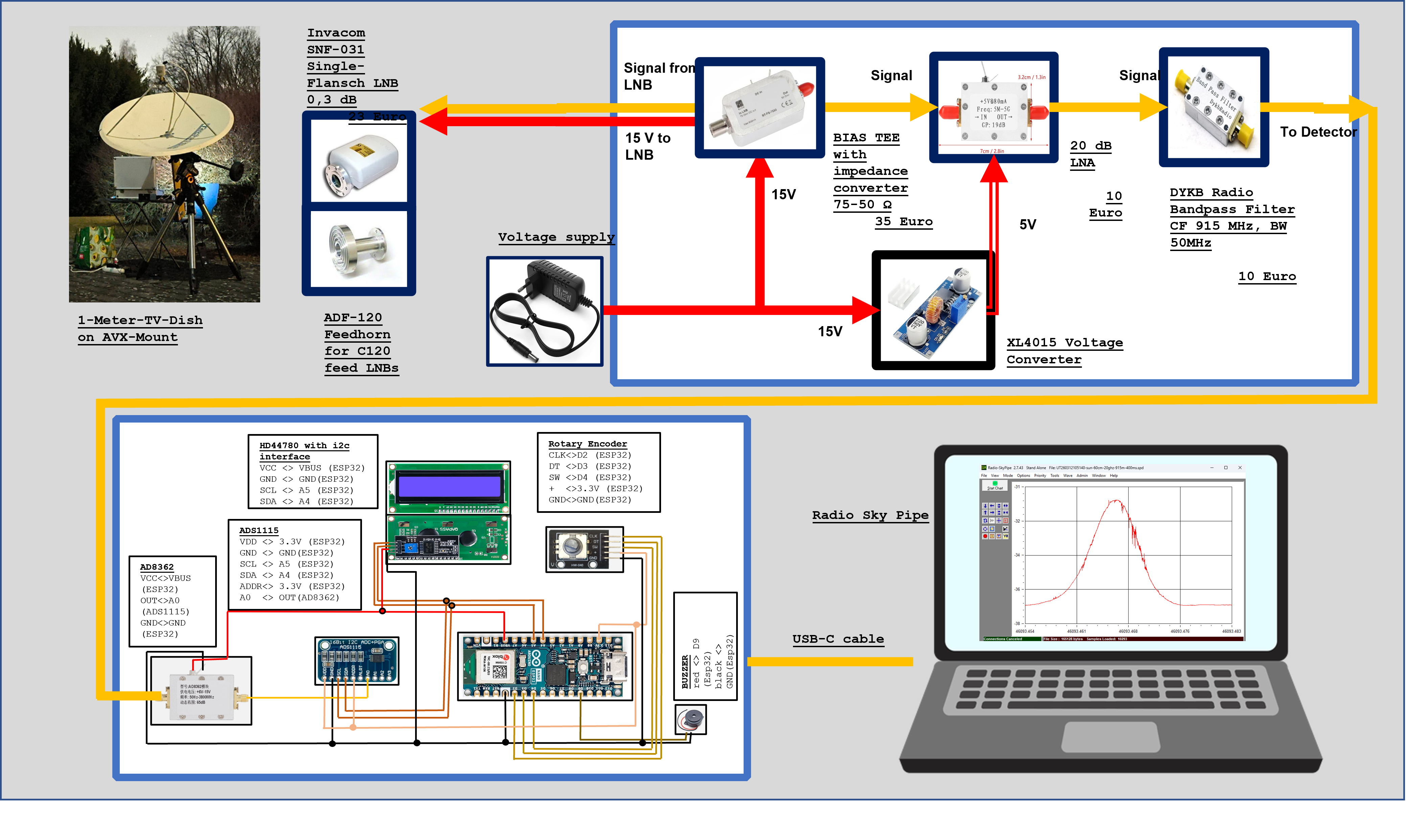 Additional features include a small LCD display showing signal strength in dBm, as well as a buzzer that converts signal variations into sound. This has proven particularly useful for aligning the antenna with strong sources such as the Sun.