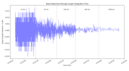 The integration time can be adjusted between 10 ms and 1000 ms using a rotary encoder. Increasing the integration time reduces noise and improves the visibility of weak signals, in accordance with the radiometer equation.
