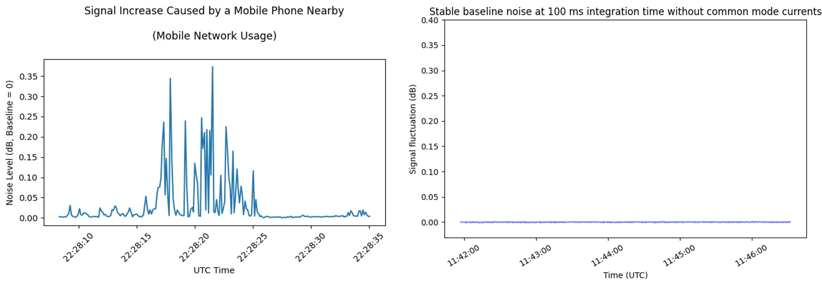 Without shielding, significantly higher noise levels were observed, partly caused by interference from nearby electronics such as displays or microcontrollers. With proper shielding, these effects are largely suppressed, resulting in a much cleaner signal.