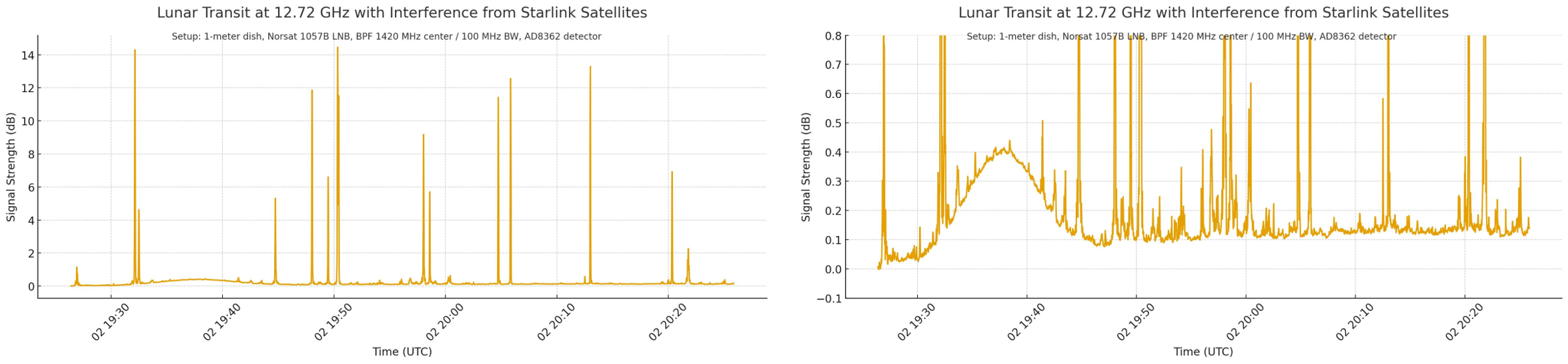 A major limitation in the Ku-band is interference from Starlink satellites, which produce strong transient signals when crossing the antenna beam. These signals can exceed the desired astronomical signal by orders of magnitude.
