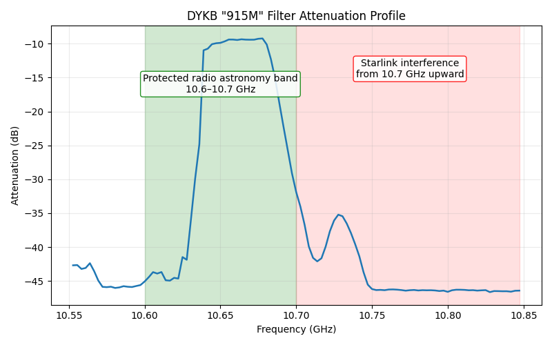 With a bandwidth of 50 MHz, the resulting frequency range falls just below the region heavily affected by Starlink transmissions. At the same time, it is well centered within the 100 MHz band (10.6–10.7 GHz) that is internationally allocated to radio astronomy.
