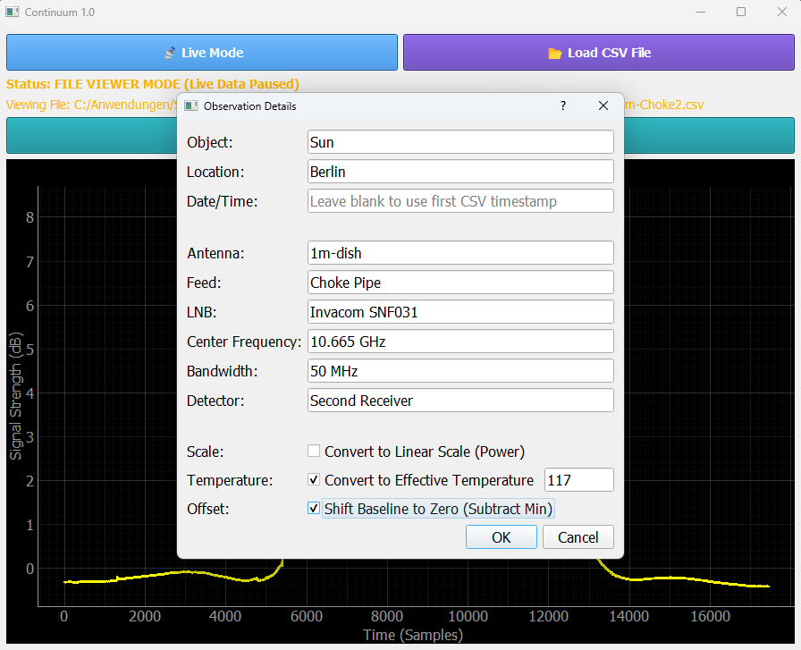 - a checkbox to convert the scaling of the y-axis to effective temperature. To do this, the system temperature of the radio telescope must be entered.
