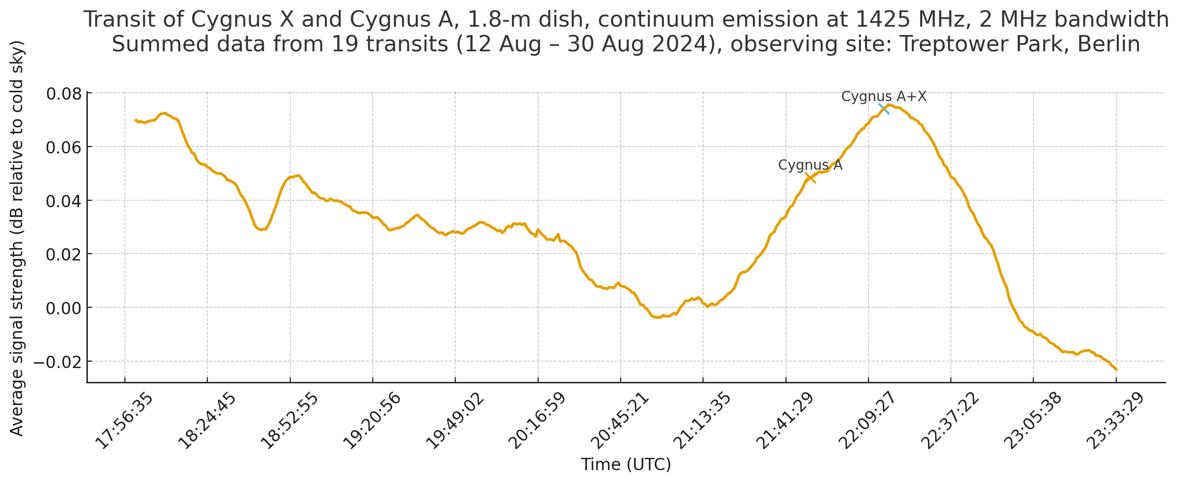 Even in the first measurement, a weak signal peak was visible at the expected transit time of Cygnus A, despite significant interference (e.g. from nearby electronic devices).