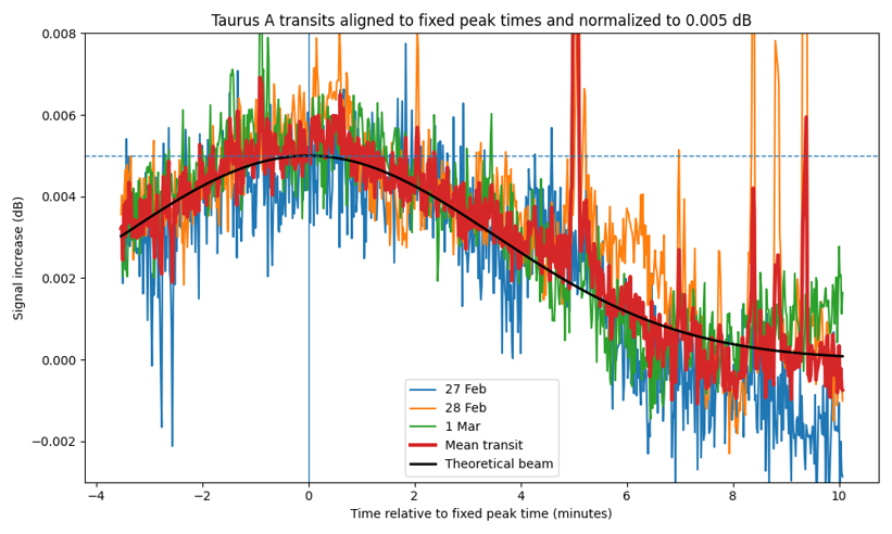 This averaging process significantly reduces noise and improves the visibility of the signal, further confirming the detection of Taurus A.