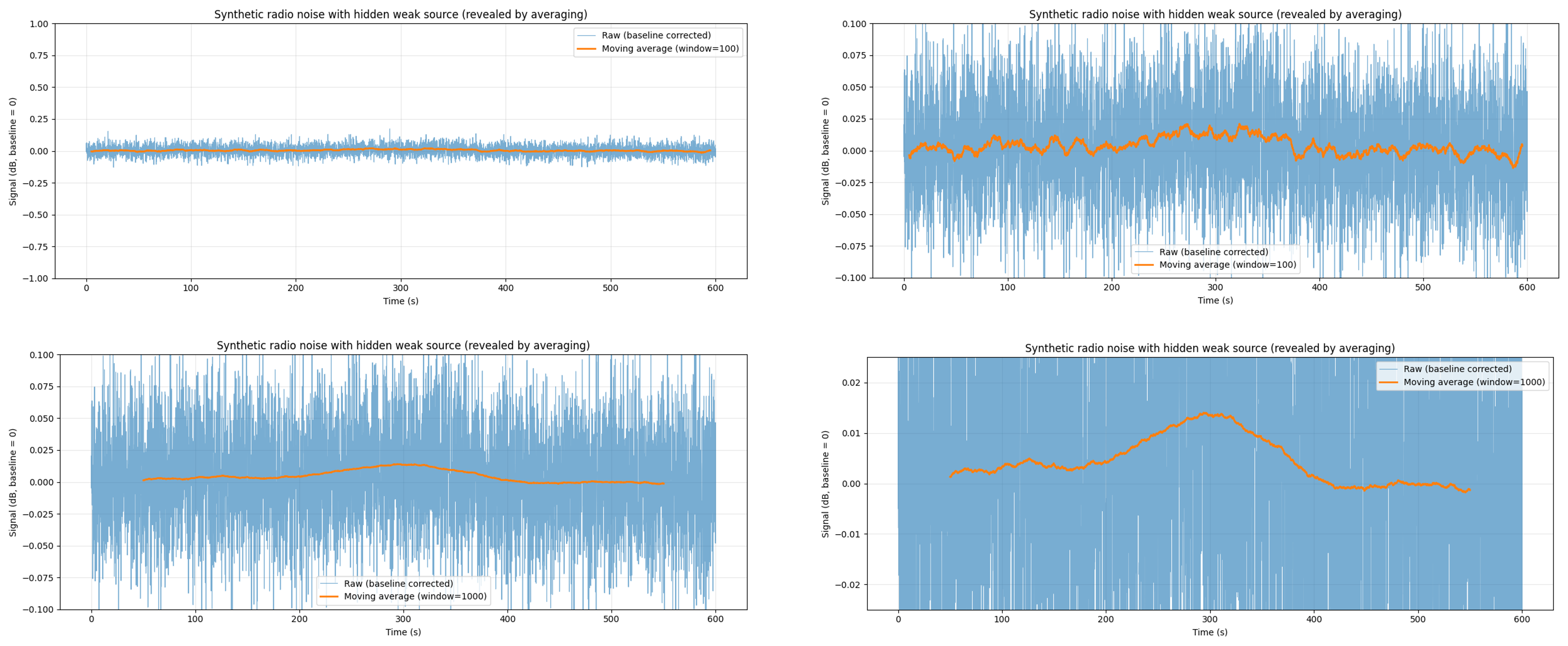 Bottom left: The moving average is now increased to a window of 1000. The orange curve begins to reveal the presence of a weak underlying signal.