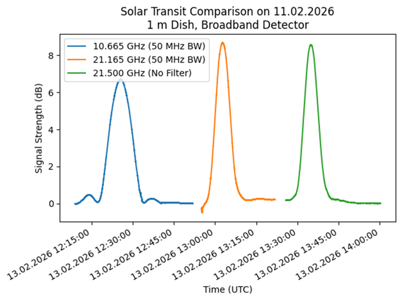 In addition, the measurement at 21.5 GHz without a bandpass filter benefits from a significantly larger effective bandwidth. This further improves the signal-to-noise ratio, making the solar transit appear even more clearly.
