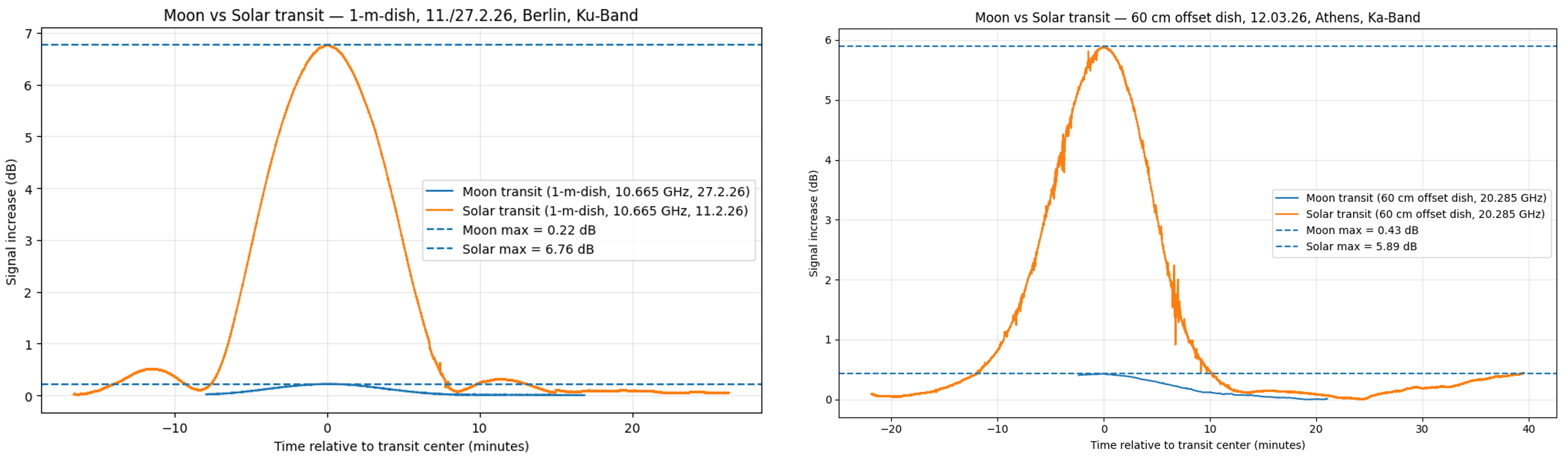 - Image 1 shows a comparison of solar and lunar transits in the Ku-band (10.665 GHz) using a 1-meter dish.