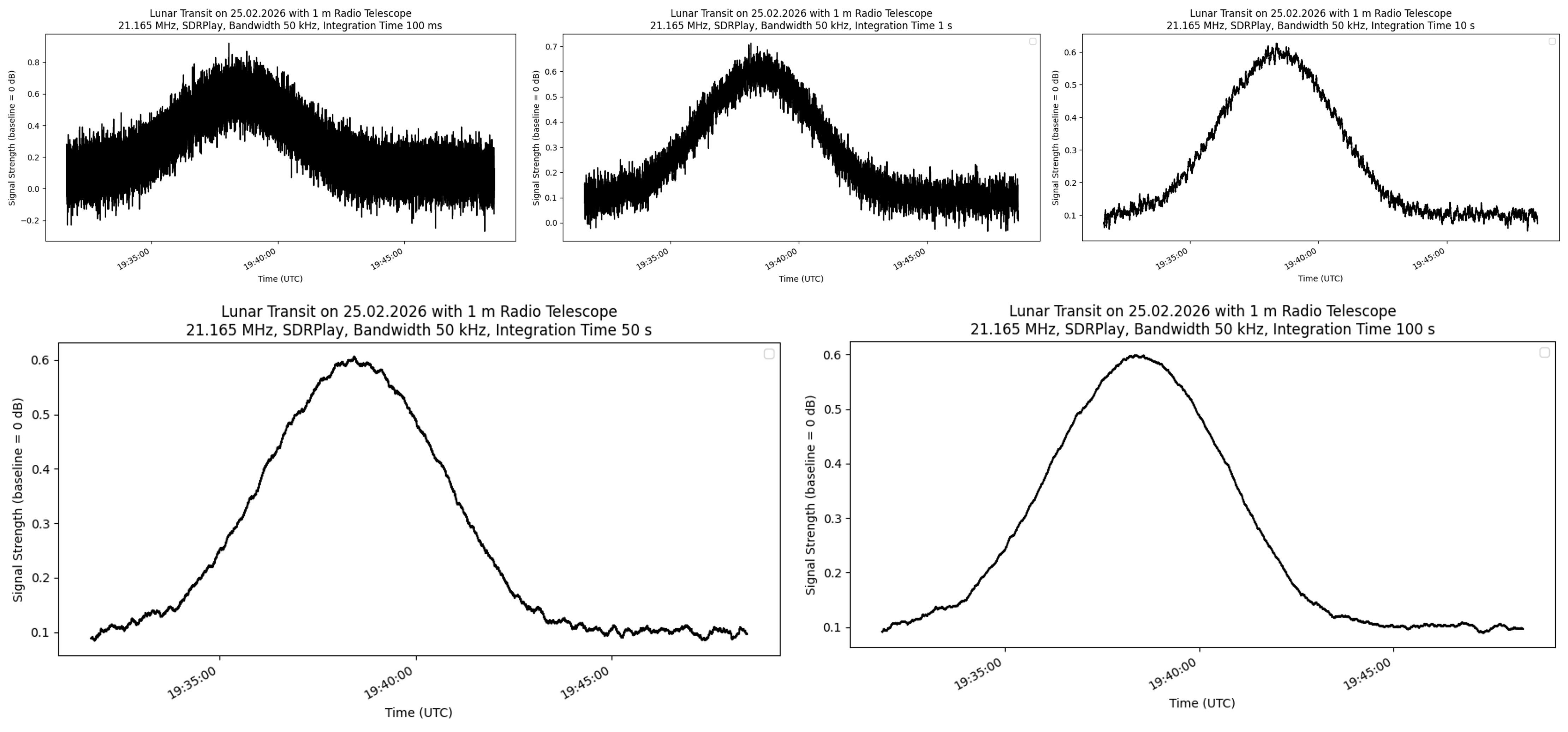 This behavior is a direct confirmation of the radiometer equation. Increasing the integration time does not amplify the signal itself, but instead reduces the statistical fluctuations of the noise. As a result, the lunar signal becomes progressively more visible and clearly defined.