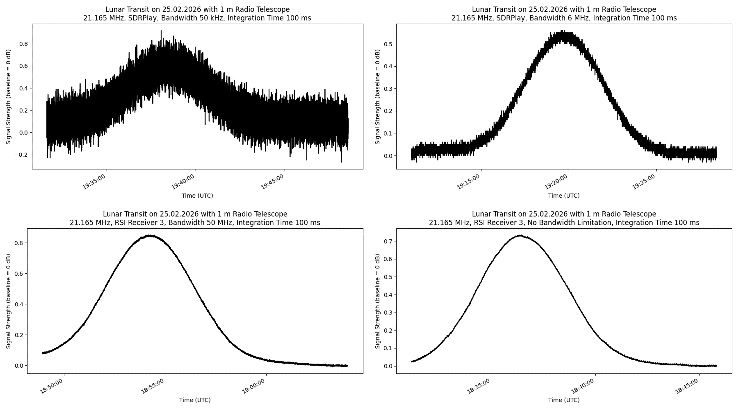 This behavior is fully consistent with the radiometer equation. Increasing the bandwidth does not increase the signal itself, but it reduces the noise through improved statistical averaging. As a result, the lunar signal becomes progressively clearer and better defined.