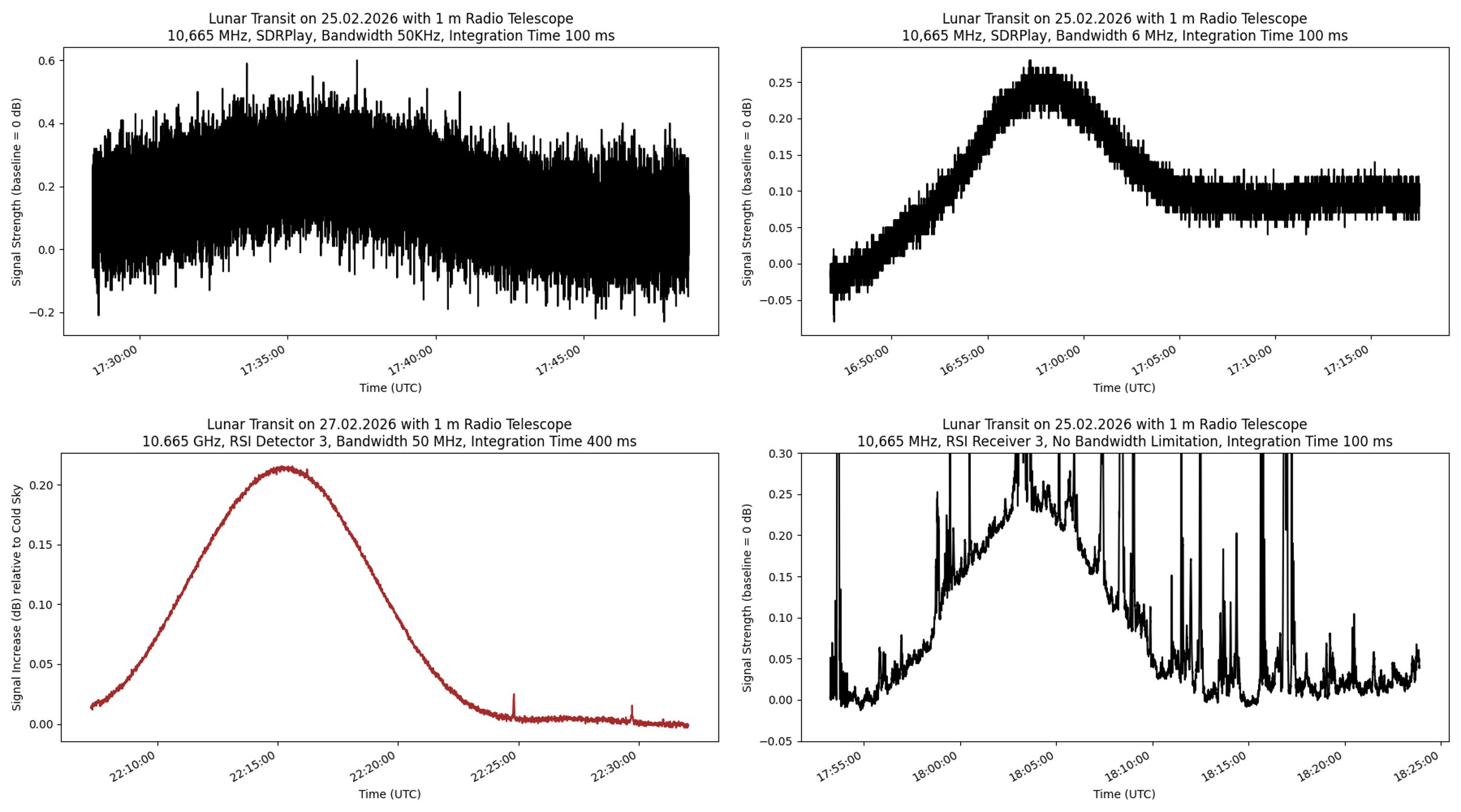 The figures again show a comparison of lunar transits observed with a 1-meter dish, this time in the Ku-band (10.665 GHz). The integration time was kept constant at 100 ms, while the receiver bandwidth was varied: