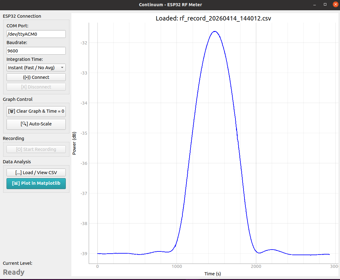 - Adjustable Integration Time: To improve the signal-to-noise ratio (SNR), the program offers dynamic signal smoothing. A time-based sliding window calculates the physically correct average (through internal conversion to linear power) over selectable time periods (e.g., 0.5s, 1.0s, 2.0s, 5.0s).