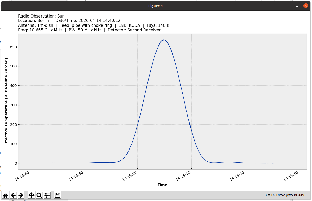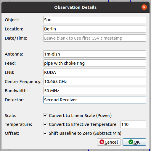 Once a measurement series is complete or loaded from a CSV, the data can be passed to Matplotlib. * Generation of high-quality, static charts perfect for scientific publications (papers, PDFs) or presentations. * Comprehensive Metadata Dialog: Before plotting, observation details such as object, location, antenna type, feed, LNB, frequency, and bandwidth can be entered. These details then appear neatly formatted as a subtitle in the final graph.