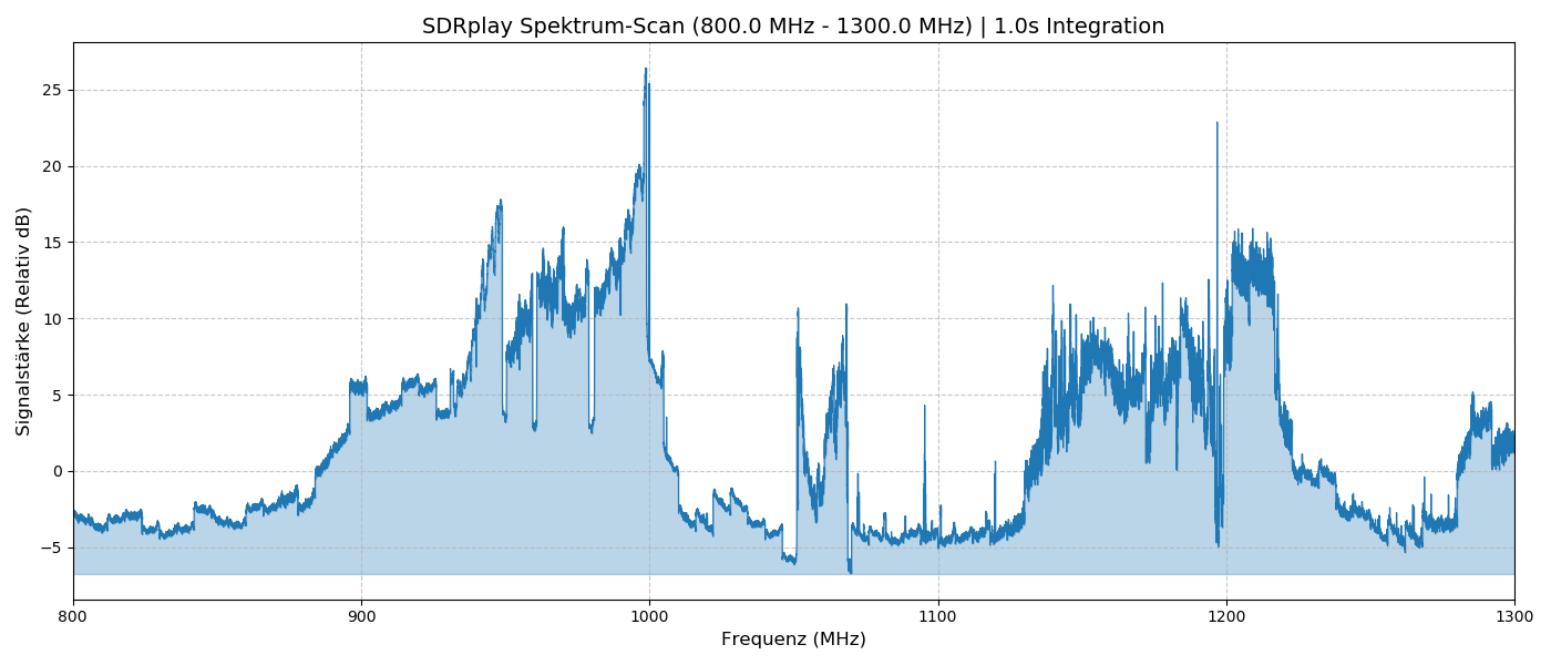Instead of taking a single snapshot, the program continuously captures and calculates the Fast Fourier Transform (FFT) for a user-defined integration time (e.g., 1 second). The linear power of these FFTs is accumulated and averaged. Once all segments are scanned, the script stitches the data together into a single, seamless array, converts the power to relative decibels (dB), and plots the full wideband spectrum.